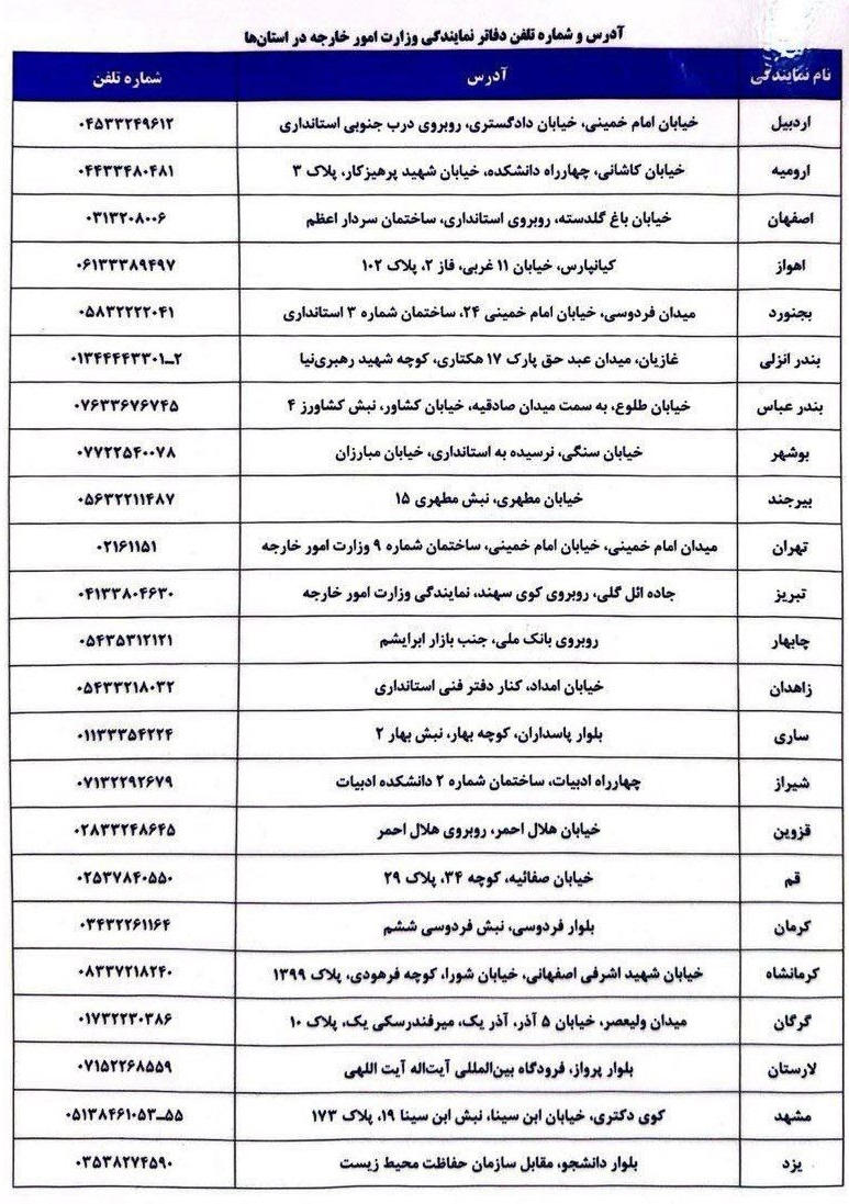 با توجه به طرح سئوال های متعدد در خصوص آدرس و تلفن اداره تایید اسناد وزارت امور خارجه در تهران و دفاتر نمایندگی وزارت امور خارجه در شهرستانها، آدرس دفاتر مذکور به شرح فوق به اطلاع و آگاهی دانشجویان و ایرانیان مقیم گرامی حوزه ولگا می رسد.